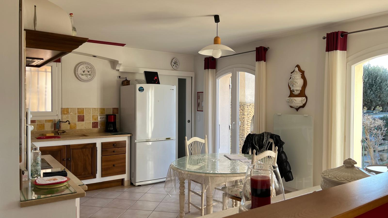 - Une cuisine ouverte sur l’espace repas et sur un petit salon avec poêle à bois, l'ensemble donne sur une terrasse au Sud,