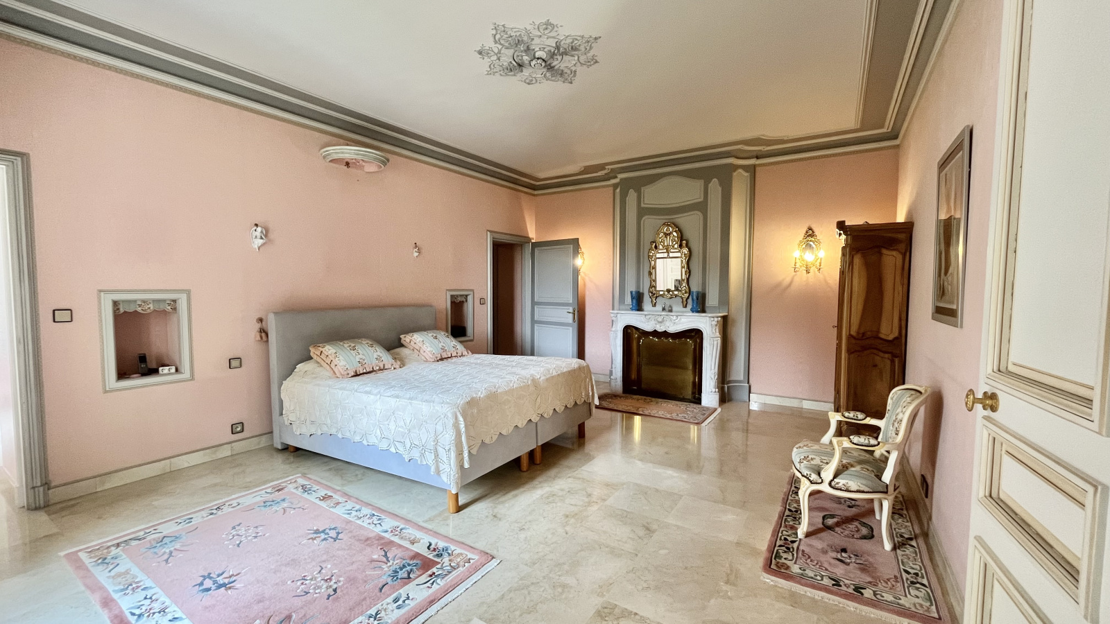 Le rez-de-jardin dispose de beaux salons lumineux aux couleurs chatoyantes, d’une salle à manger, une grande cuisine avec accès à une jolie terrasse, un grand bureau et plusieurs autres pièces avec, elles aussi, de beaux volumes.
