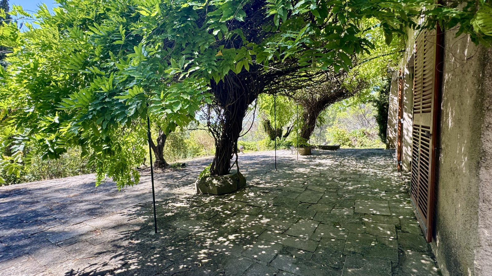 La maison d'environ 175 m² dispose de 4 chambres dont une suite à l'étage et les pièces de vie profitent d'une terrasse ombragée en été.